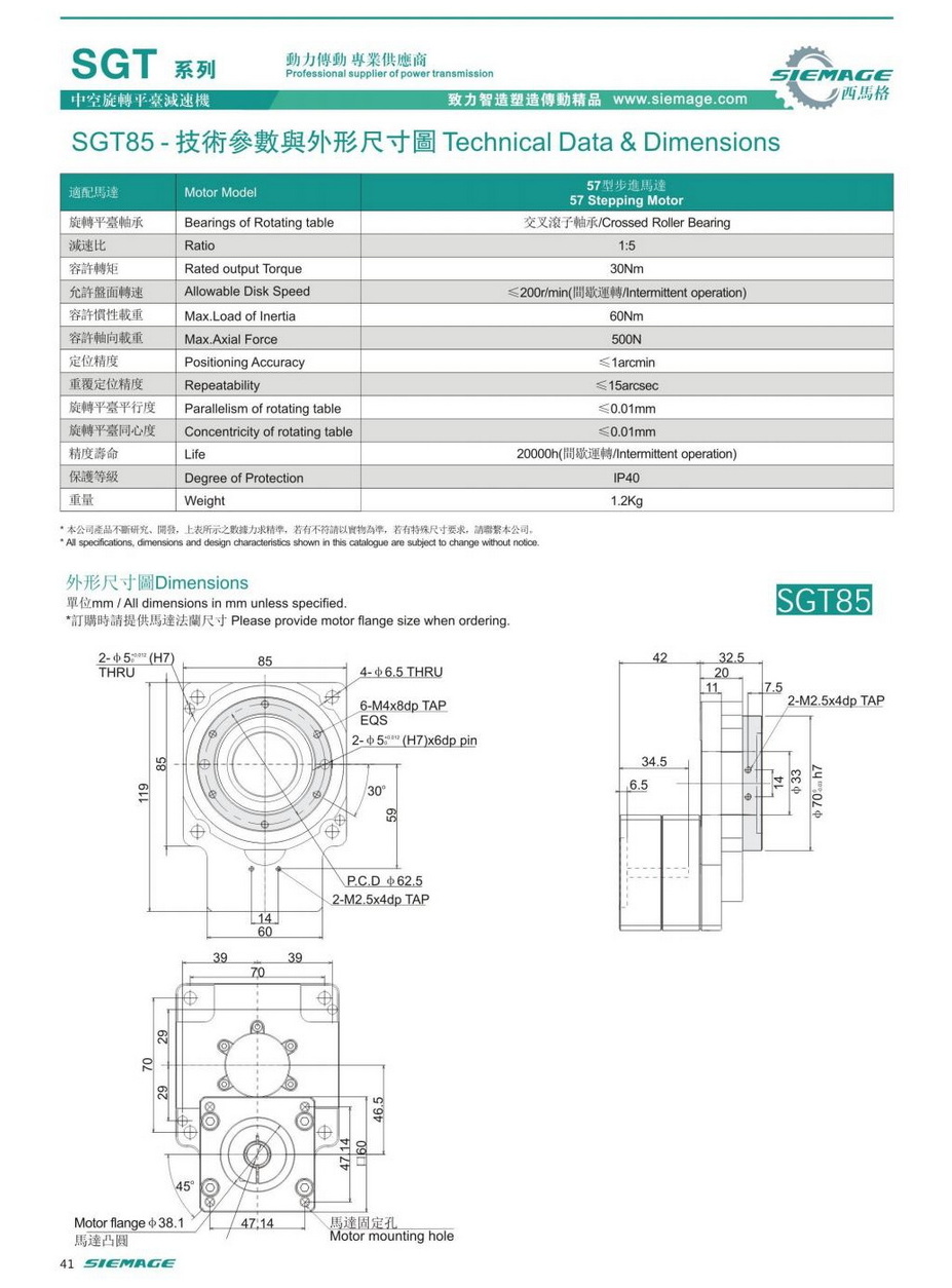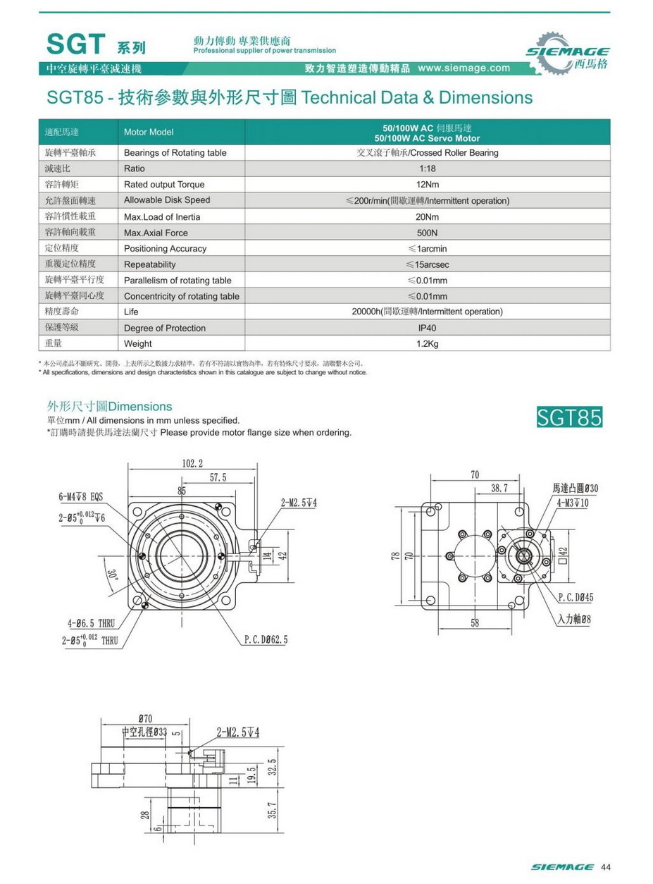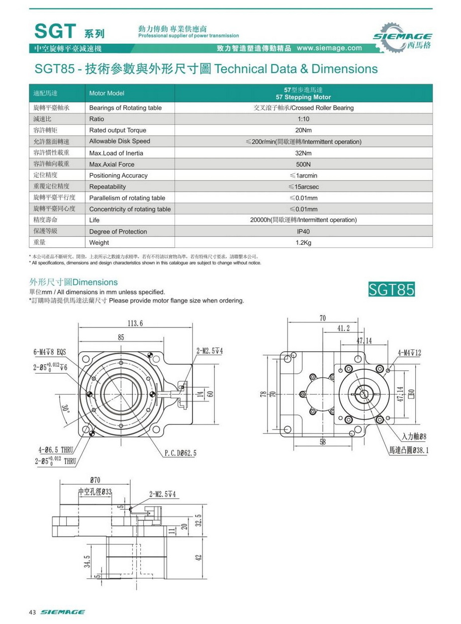 西馬格中空平臺SGT85,可配各品牌200/400W伺服電機,50/100W伺服馬達,各廠家42型步進馬達,57步進電機。減速比有1:5,1:10,1:18等。