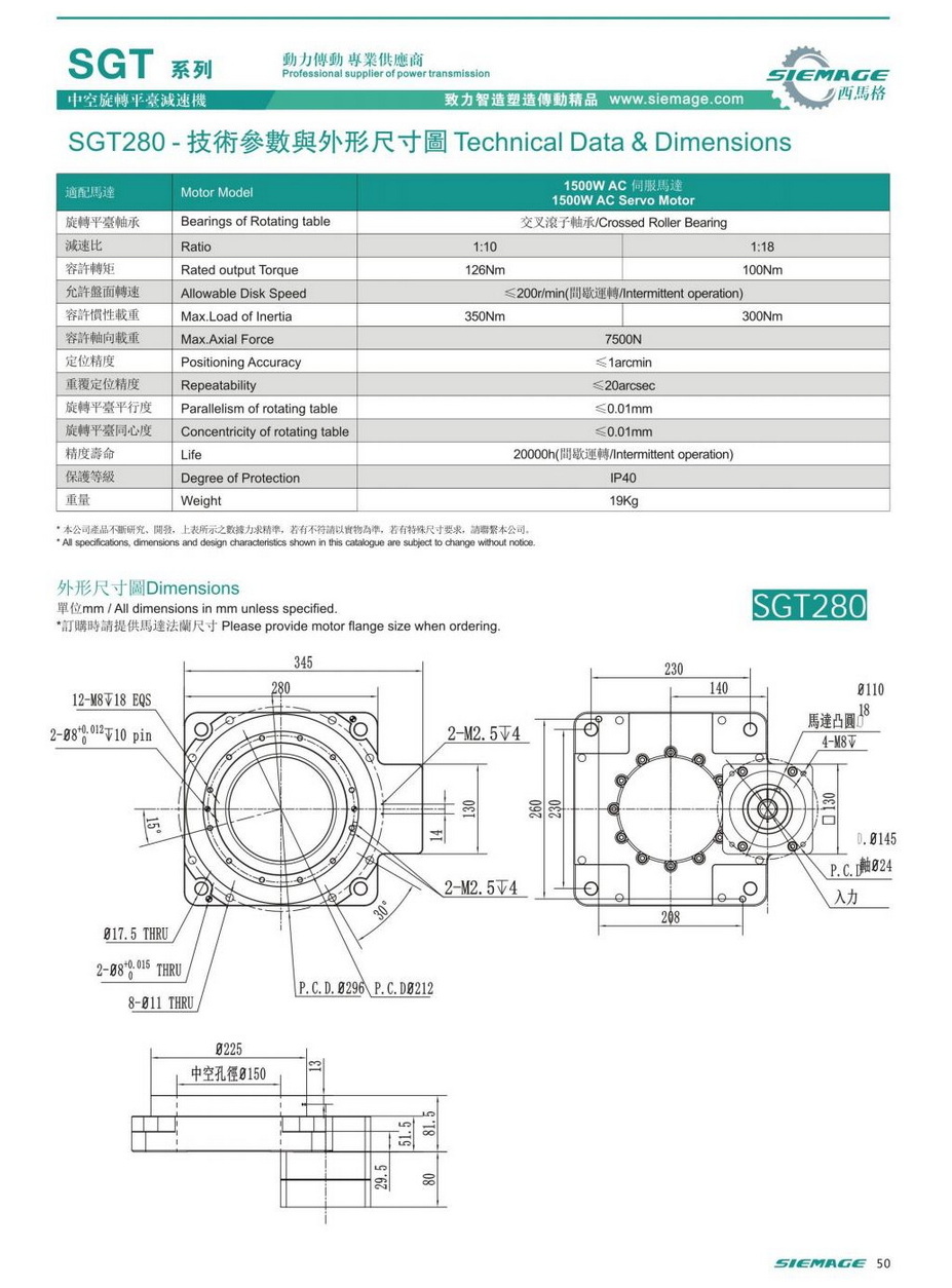 中空平臺減速機SGT280,siemage中空平臺減速機可配各品牌1500W伺服電機,伺服馬達,各廠家86型步進馬達,110步進電機。減速比有1:10,1:18等。